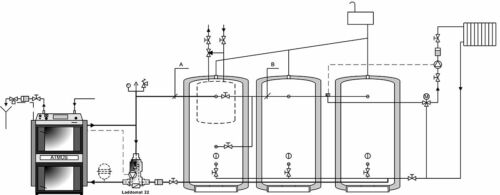 Massiver Holzofen mit Specksteinverkleidung und einem Boilersystem zur Versorgung eines Heizkörpernetzes, einer Fußbodenheizung oder eines Warmwasserspeichers.